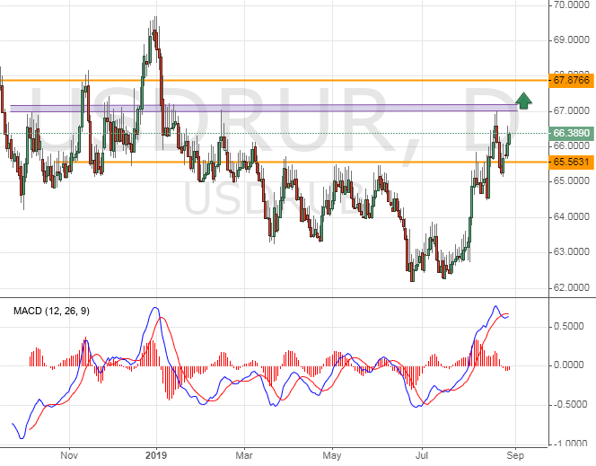 После довольно глубокого отката цена пары USDRUB, вероятно, устремится вверх в надежде пробить сопротивление в районе 67 — 67.2. Если пробой удасться, то пара направится к отметке 67.8, если нет, то ждем отката в район 65.5.