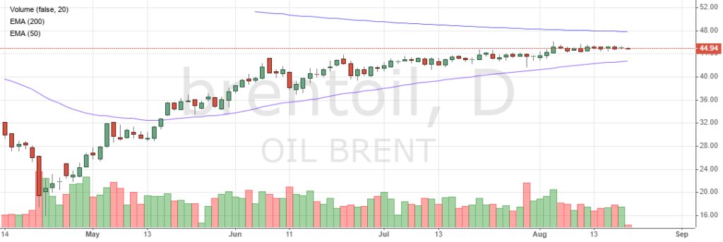 График котировок нефти Brent превращается в линию, движущуюся вокруг отметки 45$ за баррель. Цены зажаты между 50 и 200 периодными скользящими средними и ждут важных новостей для прорыва поддержки и сопротивления.