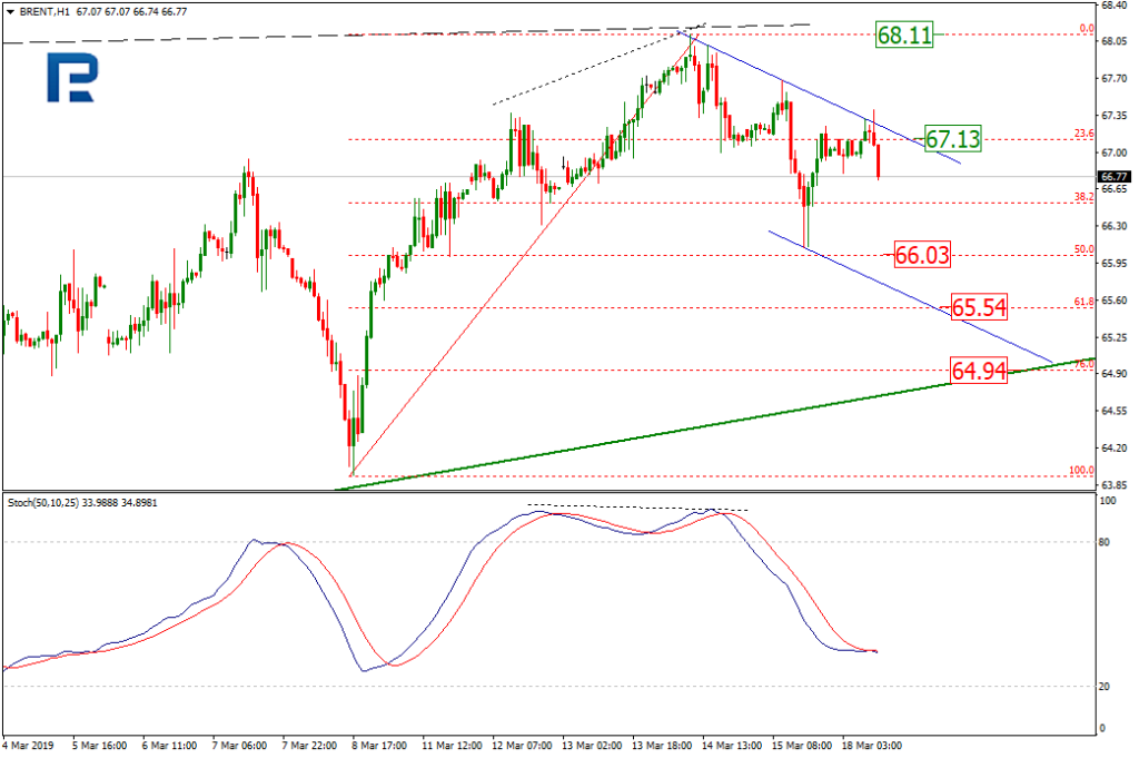 Краткосрочная техническая картина часового графика Brent демонстрирует развитие волны снижения после дивергенции на Stochastic. Цели ближайшего нисходящего движения расположены на уровнях 50,0% (66,03), 61,8% (65,54) и 76,0% (64,94) по шкале Фибоначчи относительно предыдущей волны роста.