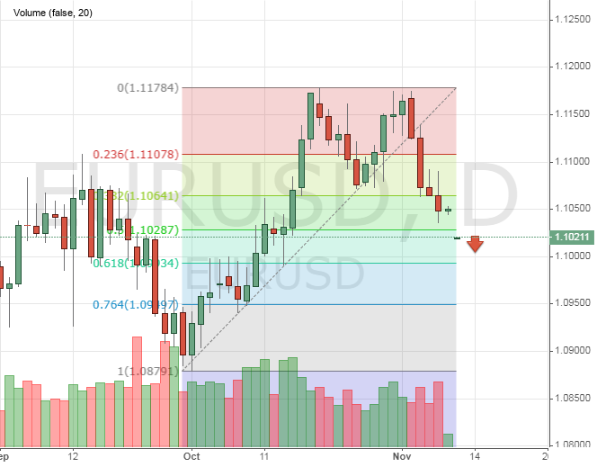 EURUSD продолжает снижение, достигнув минимума за 3 недели. Пока у евро мало причин для роста, доллар продолжает выглядеть сильнее и технически и фундаментально. Ближайшая цель падения — 61,8% по Фибоначчи в районе 1.09931.