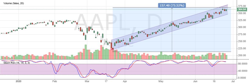 Акции компании Apple смогли вырасти на 73% с момента пика кризиса, и не дают особых сигналов на коррекцию к движению. Котировки продолжают расти, не смотря на то, что в связи с пандемией закрываются еще 14 магазинов в США.