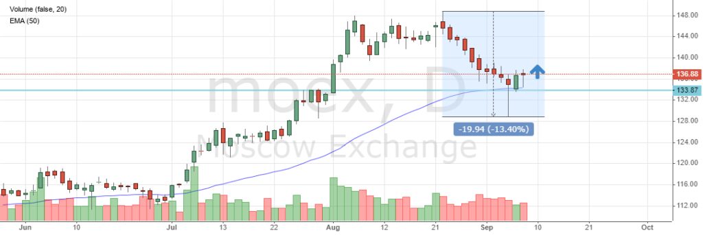 Для Мосбиржи это значит дополнительные прибыли, которые отразятся на дивидендах. С технической точки зрения акции приблизились к EMA(50), от которой сейчас отталкиваются, что также говорит о сигнале к росту стоимости.