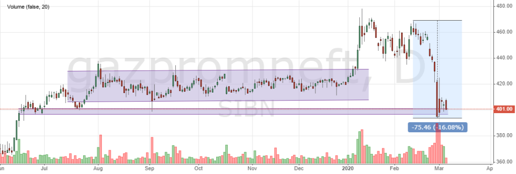 С начала марта акции Газпром нефть потеряли в цене 75 рублей или 16%, не смотря на повышение прибыли компании на 6.2% и принятого решения отправить на выплату дивидендов 50% от чистой прибыли по МСФО. Сейчас котировки приостановили падение возле сильного уровня поддержки. Вероятно, что коррекция к падению заставит вернуться стоимость акций «Газпром нефть» к предыдущему боковому каналу 405-430 рублей за бумагу.
